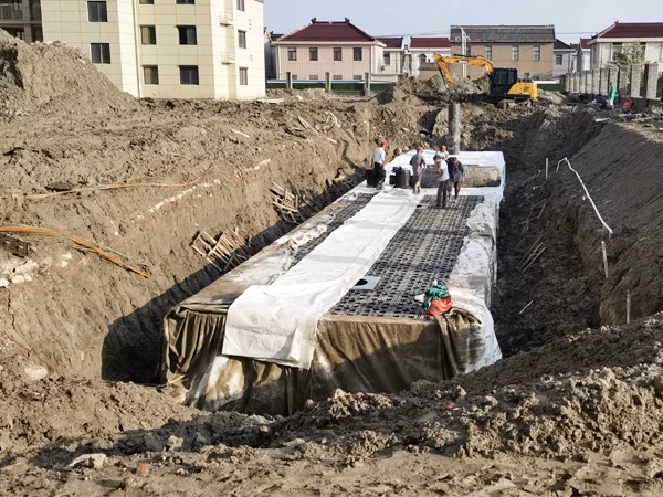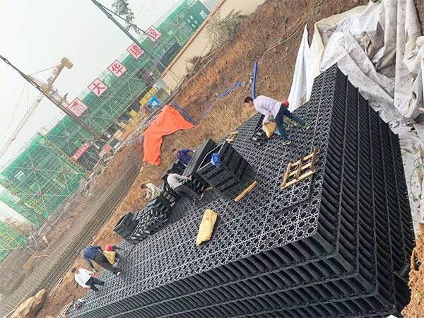 PP模塊構筑物采用聚丙烯塑料單元模塊組合,在水池周圍包裹防滲土工布,形成地下貯水池。由于表面光滑,不滋生藻類,可使儲存的水體水質保持較長時間穩定。再有模塊式的組合,可使雨水集蓄池極大的適應場地的限制,組成各種形狀,同時具有安裝方便,承載力大,可拆除遷移至其他區域繼續使用等優點。